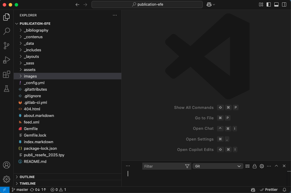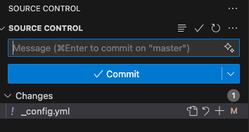 - cliquez sur _config.yml, le contenu s'affiche dans la partie centrale. Ce fichier est tau format Yaml qui est très simple sous la forme d'un ensemble d'attributs/valeurs sous la forme attribut:valeur. Les atttributs sont par convention en minuscule, sans accent, sans espace. Les valeurs sont quant à elles plus libres et peuvent être des chaines de caractère normalement entre simple ou double quotes, des tableaux entre [], ...